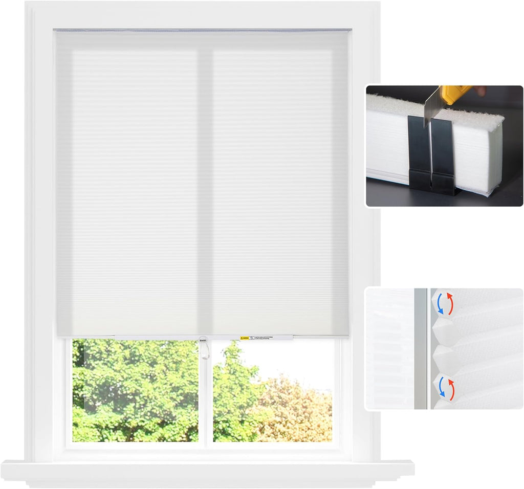 Easy Install Cellular Shades - No Drill Blinds for Windows, Blackout Shades No Drill, Custom Honeycomb Blinds for Easy Cutting - Telescopic Track (White, 39 x 64 in)